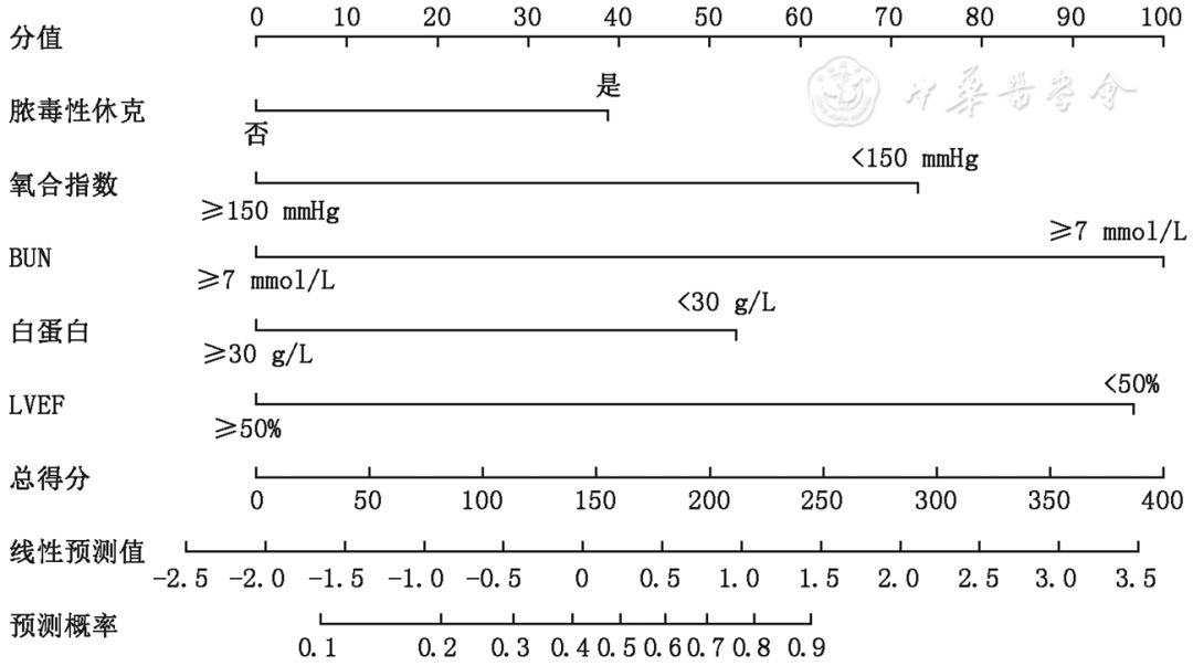 进一步的ROC曲线显示脓毒性休克、氧合指数、BUN、白蛋白及LVEF联合用以预测AKI的敏感度及特异度分别高达76.8%及85.4%。列线图更直观地量化了这5个指标与AKI的关联。这些指标较全面地反映了机体的循环、氧合、感染、代谢及心功能状态对肾脏的影响,在临床诊治过程中可随时获得并能有效的预测SCAP患者AKI的发生。