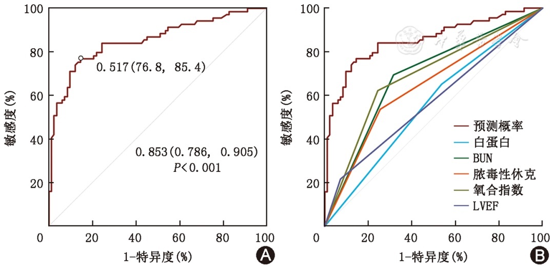 3. 联合指标预测SCAP患者发生AKI的ROC曲线:脓毒性休克、氧合指数<150 mmHg、BUN>7 mmol/L、白蛋白<30 g/L及LVEF<50%预测SCAP患者发生AKI的准确性见表3。5项指标联合预测AKI的敏感度为76.8%,特异度为85.4%,曲线下面积(area under curve,AUC)为0.853,95% CI为0.786~0.905,P<0.001;见图1A。5项指标单独预测AKI的ROC曲线见图1B。