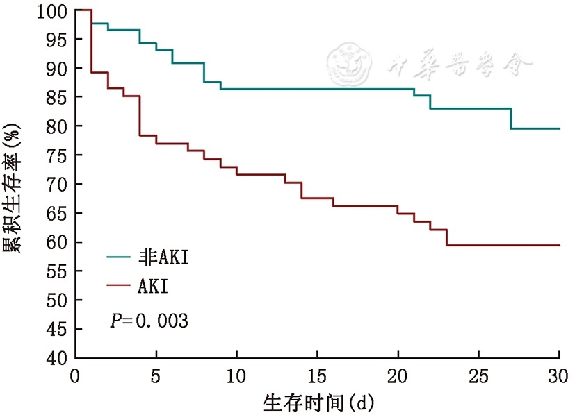 5. SCAP患者的生存曲线:162例SCAP患者中48例(29.5%)在30 d内死亡。非AKI组病死率20.5%(18/88);AKI组病死率40.5%(30/74),其中AKI 1期患者病死率29.2%(14/74)死亡14例,AKI 2/3期患者病死率61.5%(16/74)。Kaplan-Meier法生存分析示AKI组患者30 d累积生存率低于非AKI组(P=0.003),见图4。