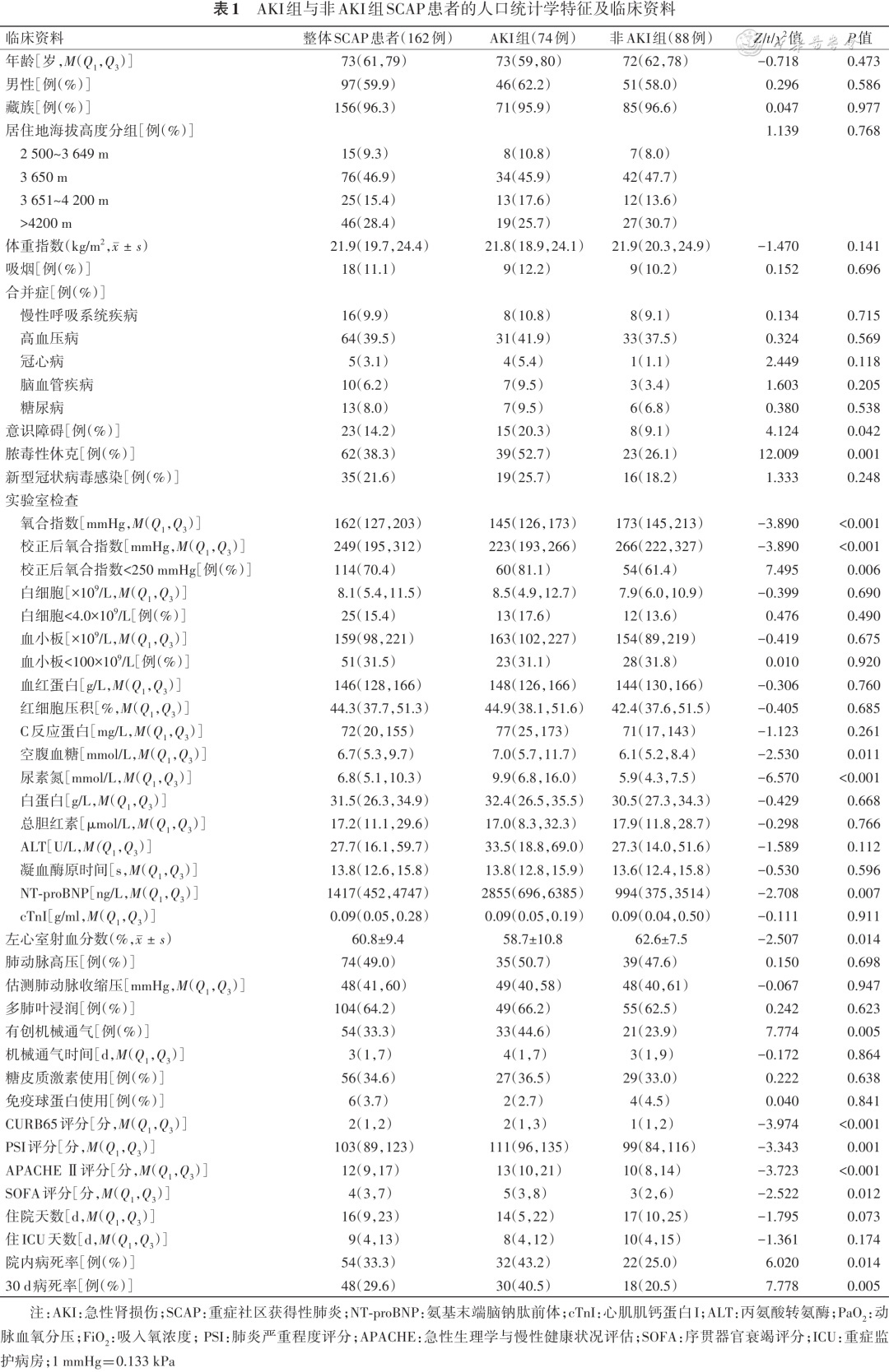 1. AKI组与非AKI组SCAP患者人口统计学及临床资料比较:研究共纳入162例SCAP患者,符合主要诊断标准66例,符合次要诊断标准96例;入选患者中男性97例,女性65例,年龄73(61,79)岁。162例患者中,藏族156例(96.3%),汉族4例(2.5%),其他民族2例(1.2%)。45.7%(74/162)的患者发生AKI,其中 AKI 1期患者48例,AKI 2期患者15例;AKI 3期患者11例。接受连续肾脏替代治疗的患者7例。